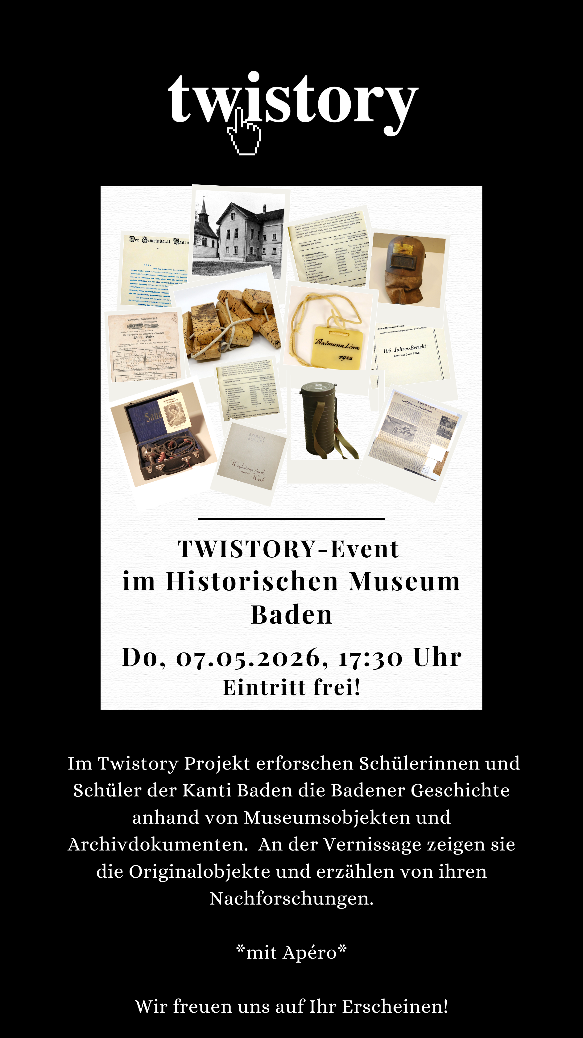 Am Donnerstag, 07. Mai 2026 ist es wieder so weit: Im TWISTORY-Event im Historischen Museum Baden präsentieren die Schülerinnen und Schüler der Kanti Baden um 17:30 Uhr ihre Erkenntnisse über Museumsobjekte und Archivdokumente.